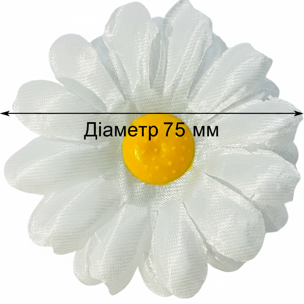 Ромашка з округлими пелюстками, виготовленими з текстильного матеріалу з легкою фактурою. Центральна частина — гладка, куполоподібна, з рівною поверхнею. Конструкція квітки легка, добре тримає форму, підходить для декору, флористики та оформлення невеликих композицій.