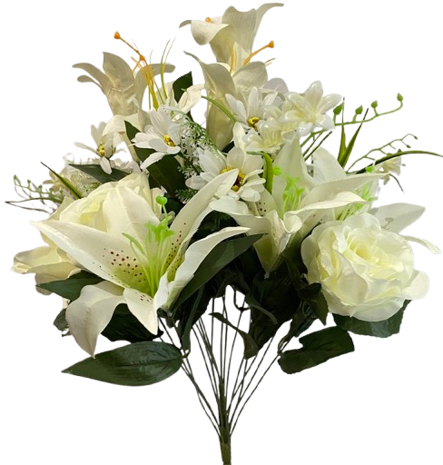 Sztuczny bukiet 16133029 , łączący duże, dekoracyjne lilie, róże, drobne kwiaty i soczystą zieleń florystyki. Kompozycja prezentuje się estetycznie i naturalnie, co czyni ją idealną propozycją do wykorzystania w florystyce rytualnej – dekoracji pomników, miejsc pamięci czy cmentarzy. Produkt wykonany jest z wysokiej jakości tekstyliów i tworzywa sztucznego, co gwarantuje długą żywotność i zachowanie wyglądu.