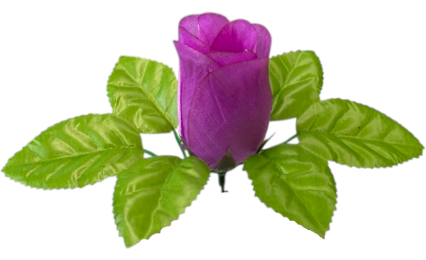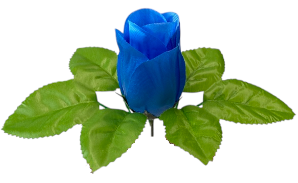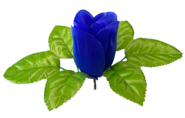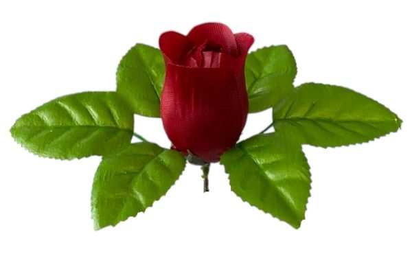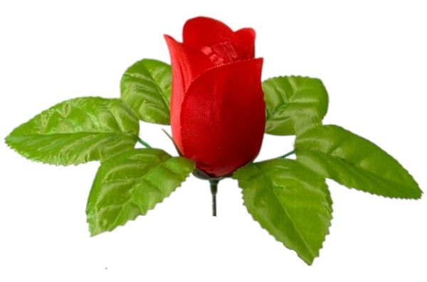 Sztuczny pąk róży w jaskrawym kolorze, otoczony kilkoma błyszczącymi, zielonymi listkami. Wykonany z tkaniny, idealny do dekoracji i kompozycji kwiatowych.
