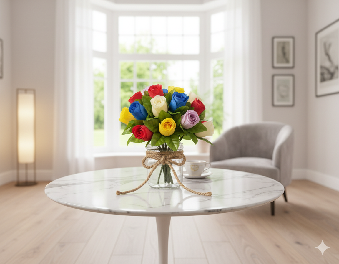 Sztuczny kwiat "Róża R7" . Obszerny, wielowarstwowy, z dekoracyjną, wzorzystą podstawą. Nadaje się do dekoracji, florystyki i dodatków.