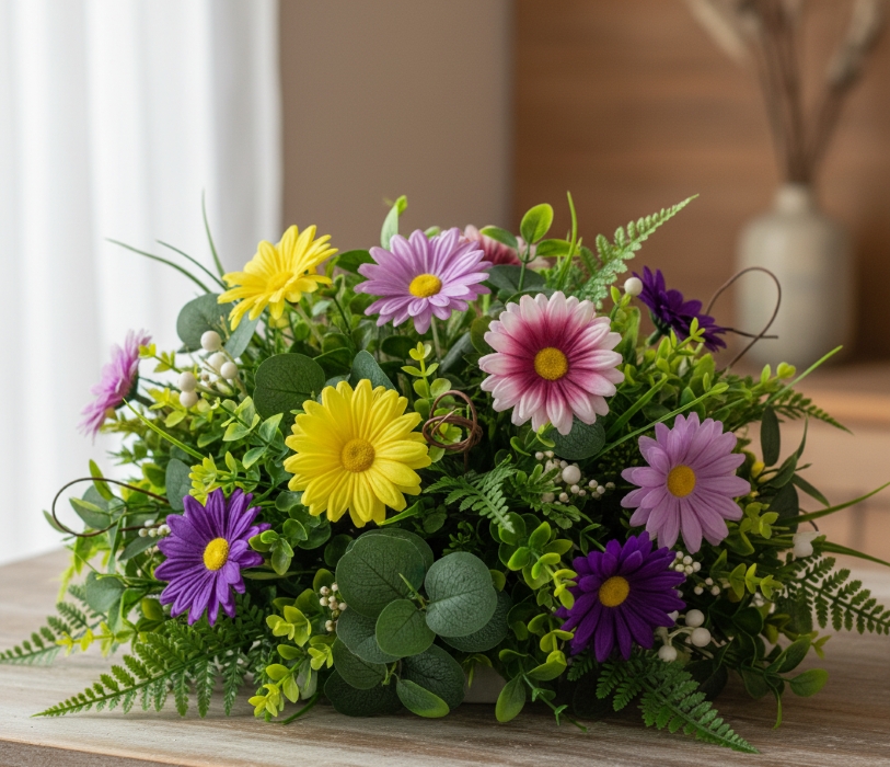 Sztuczny kwiat gerbery z jaskrawożółtym środkiem to realistyczny i estetyczny element kompozycji florystycznych i dekoracyjnych. Wykonany z wysokiej jakości materiału tekstylnego, który doskonale oddaje strukturę prawdziwego płatka.