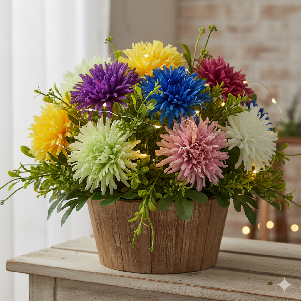 Sztuczny kwiat "Chryzantema 02" , wykonany z wysokiej jakości materiału, charakteryzuje się obszernym, gęstym kształtem z licznymi falistymi płatkami, które tworzą bujną, kulistą sylwetkę. Kwiat wygląda realistycznie dzięki precyzyjnemu wykonaniu detali i matowej fakturze powierzchni. Jest odporny na działanie czynników zewnętrznych, co czyni go uniwersalnym do wykorzystania we wnętrzach, kompozycjach florystycznych i dekoracjach obrzędowych.