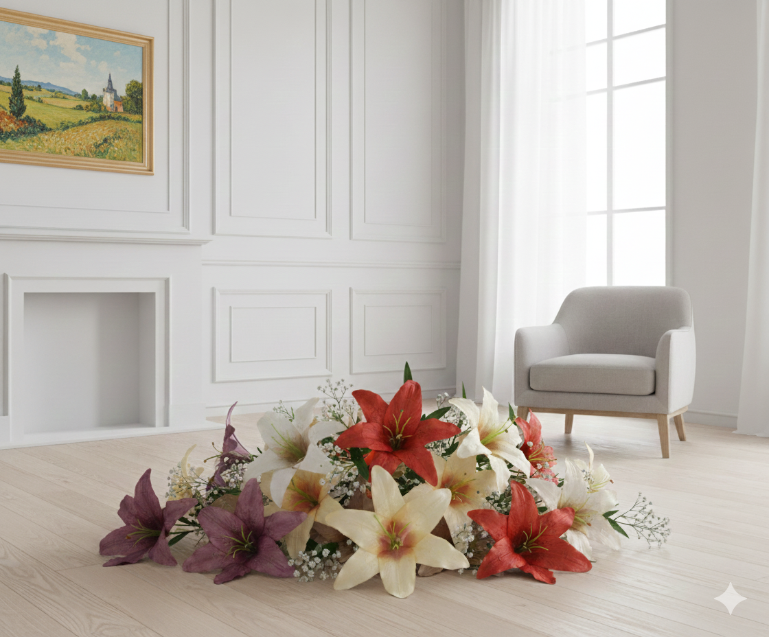 Sztuczny kwiat Lilia 03 to element dekoracyjny o realistycznym designie, przeznaczony do dekoracji kompozycji, wnętrz i florystyki rytualnej.