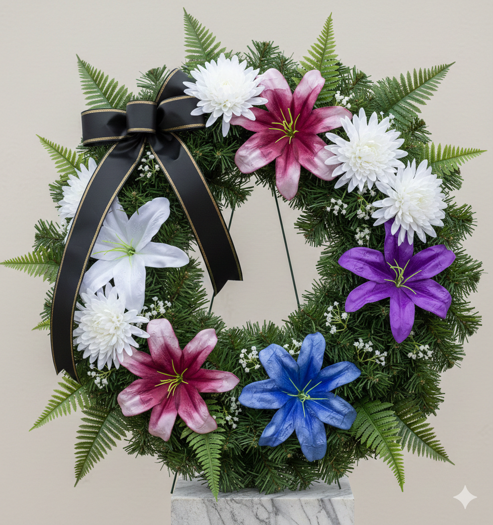 Wykonany z lekkiego, ale gęstego materiału syntetycznego o przyjemnym satynowym połysku. Dzięki wysokiej jakości wykonania i uniwersalnemu wzornictwu, nadaje się zarówno do dekoracji świątecznych, jak i florystyki rytualnej – w szczególności do ozdabiania wieńców żałobnych, koszy, kompozycji żałobnych itp.