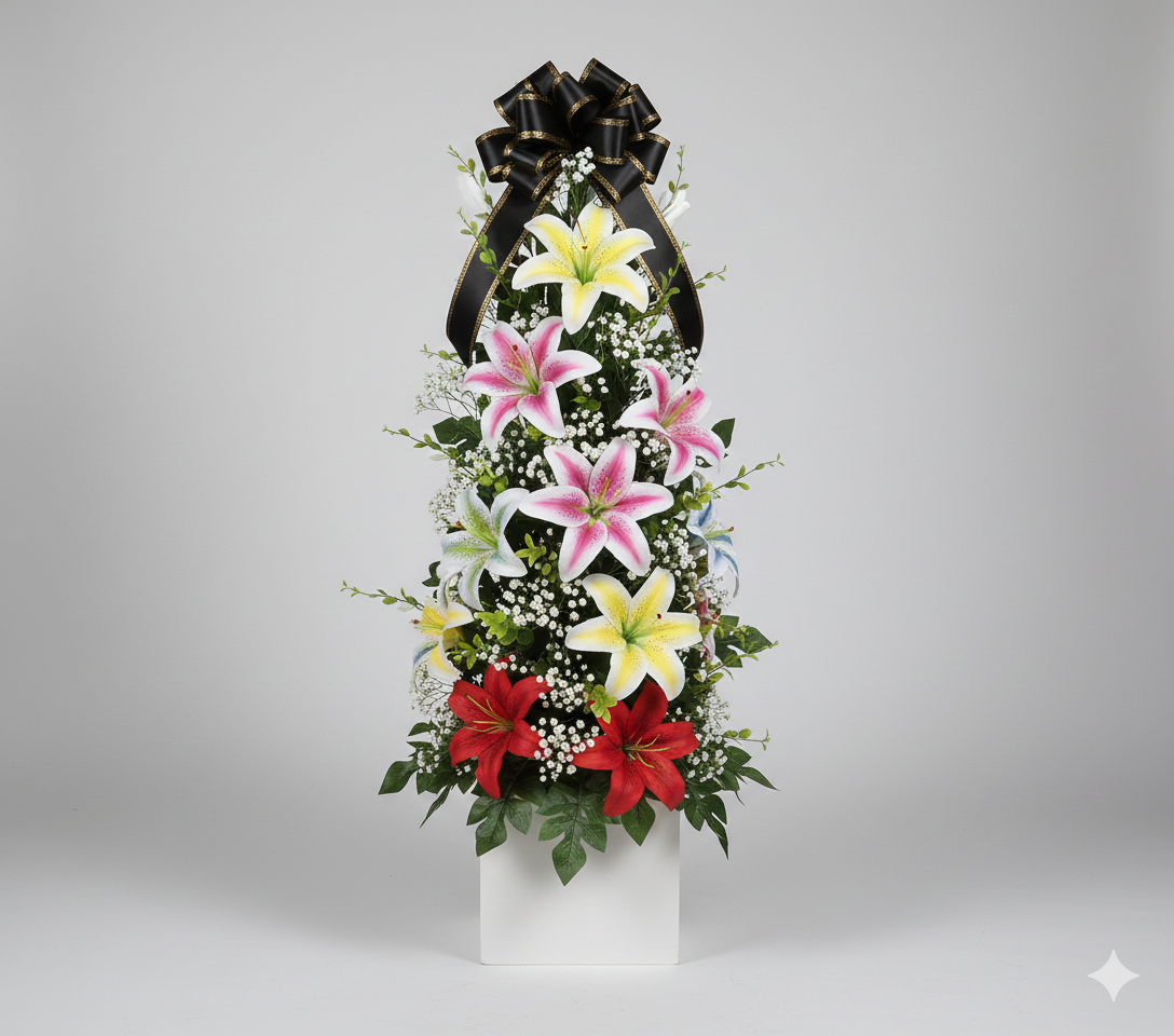 Sztuczny kwiat Lilia 01 to estetyczny element kompozycji dekoracyjnych i obrzędowych, wykonany z trwałego materiału o realistycznym efekcie.