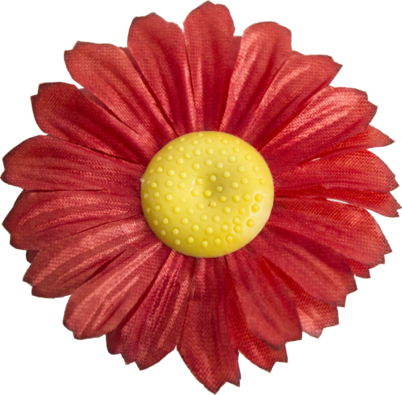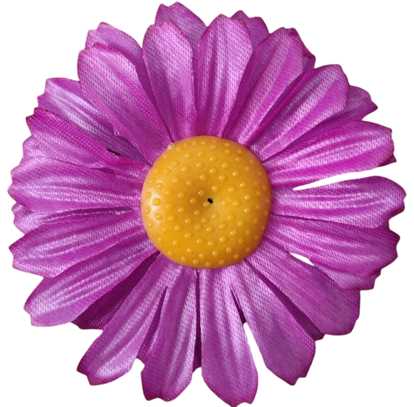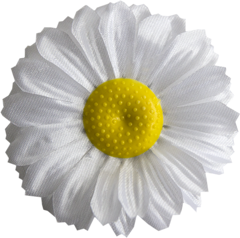 Klasyczna stokrotka o estetycznie zaprojektowanych płatkach, wykonana z materiału tekstylnego o przyjemnej satynowej fakturze. Środkowa część kwiatu jest tłoczona, zaokrąglona, z dekoracyjną powierzchnią, która dodaje mu realizmu. Kompaktowy rozmiar i stabilna forma sprawiają, że nadaje się do różnego rodzaju dekoracji.