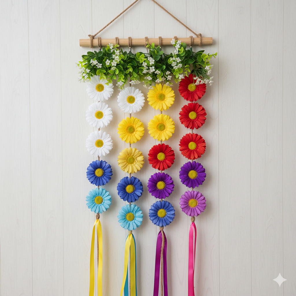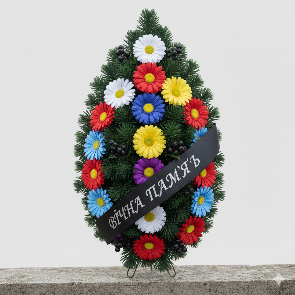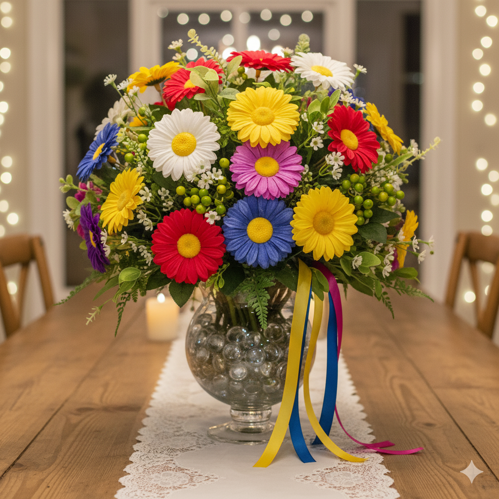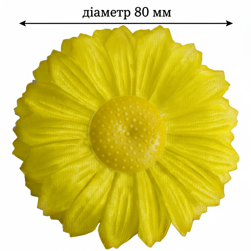 Sztuczny kwiat Rumianek . Materiał tekstylny, z obszernym rdzeniem i gęstymi płatkami. Przeznaczony do dekoracji dekoracyjnych i rytualnych.