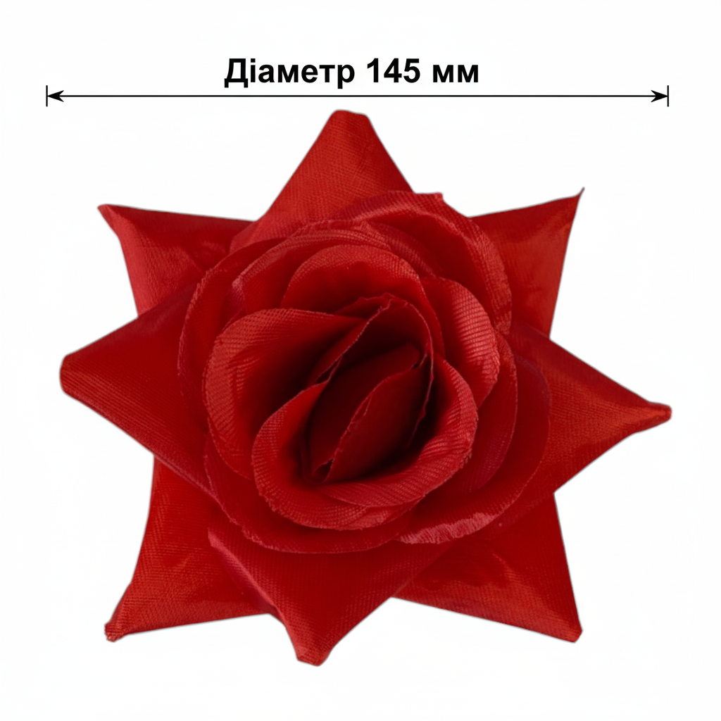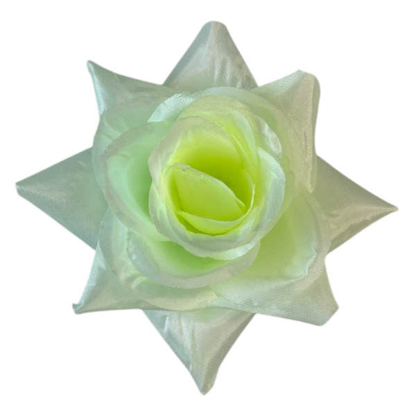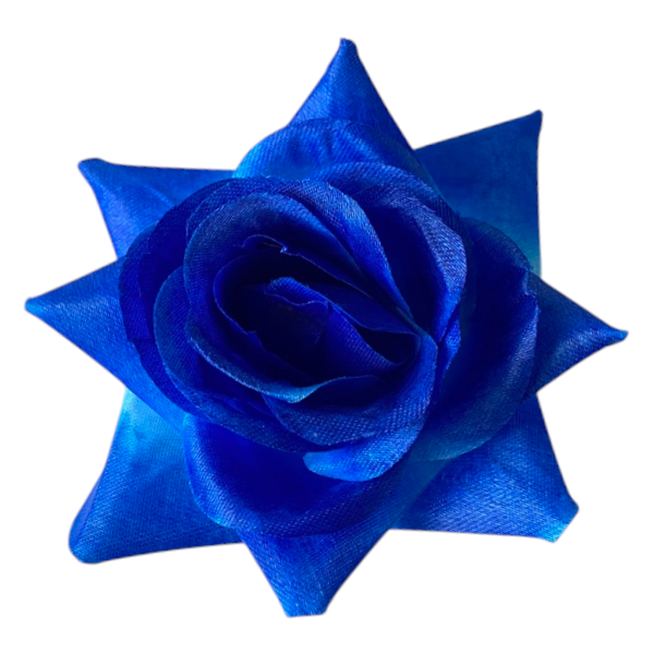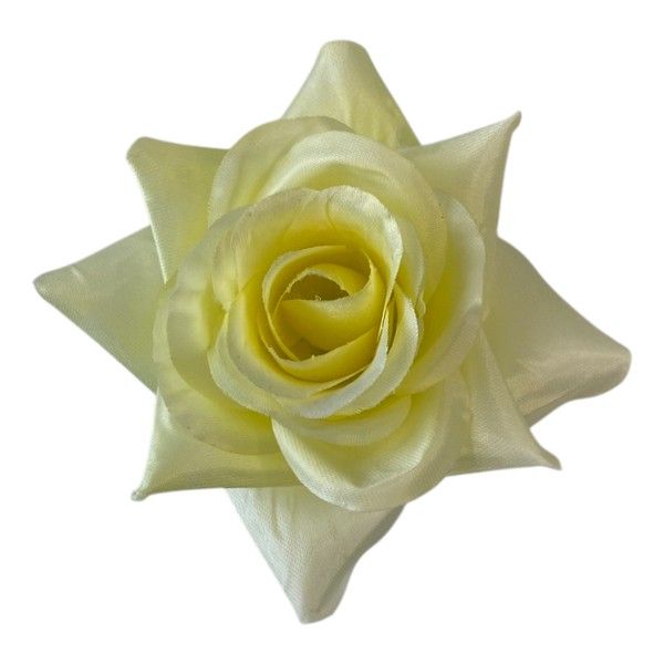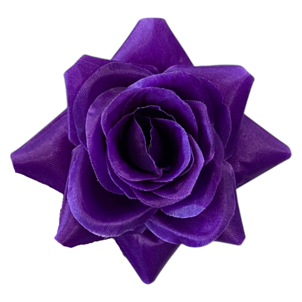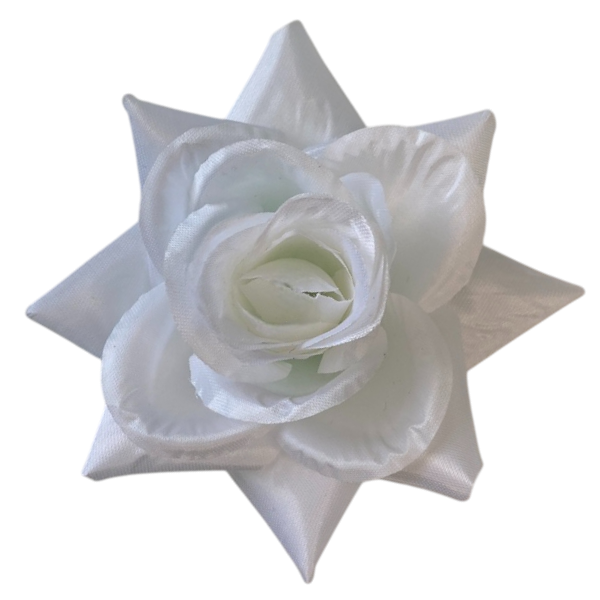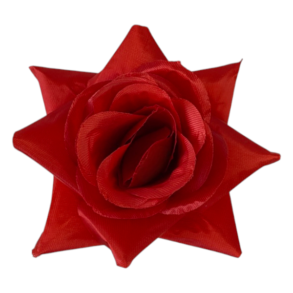 Obszerna sztuczna róża z wielowarstwowymi, tekstylnymi płatkami ułożonymi w klasyczny, spiralny kształt. Centralna część jest gęsta, z miękkim wgłębieniem, otoczonym grubymi płatkami. Podstawa ozdobiona jest ozdobnymi, spiczastymi elementami w kształcie gwiazdy, które nadają kwiatowi objętości i dekoracyjności. Materiał jest przyjemny w dotyku i zachowuje swój kształt nawet przy częstym użytkowaniu.